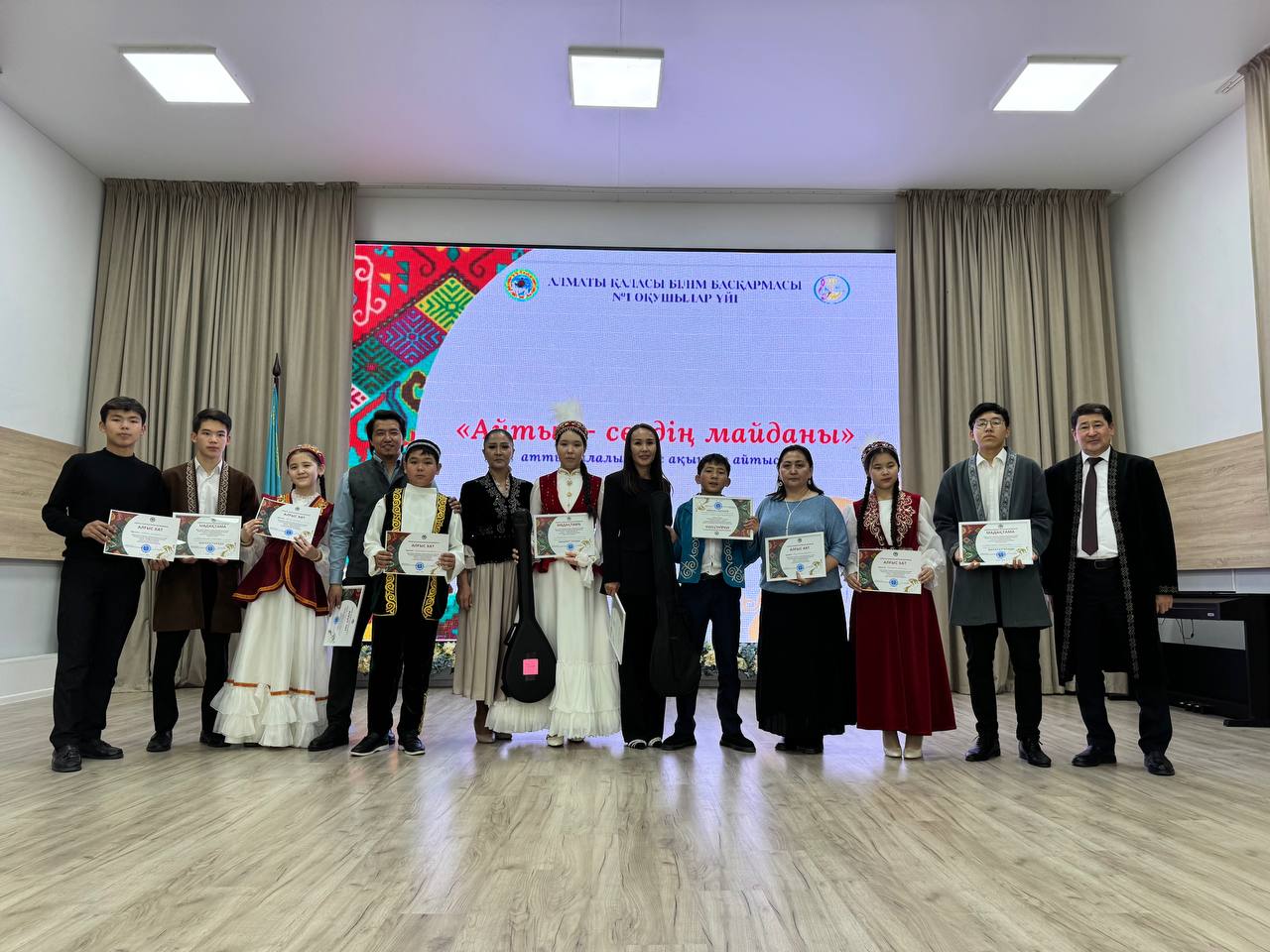 ⚜️Сахна төрінде суырыпсалма өнердің шеберлері терең мазмұнды, отты айтыс өрбітіп,көрерменнің зор қошеметіне ие болды. Жүзден жүйрік, мыңнан тұлпар шыққан Бостандық ауданының 10 сынып оқушысы Інжу Батырхан айтыстың бас жүлдесін көркем келбет, тәрбиелі тартыс, сұлу сөзбен жеңіп алды. Барлық қатысушылардың жалынды жырлары ұрпақ санасында жаңғырып, қазақ айтысының мәңгі жасай берер көрінісін көрсетті.